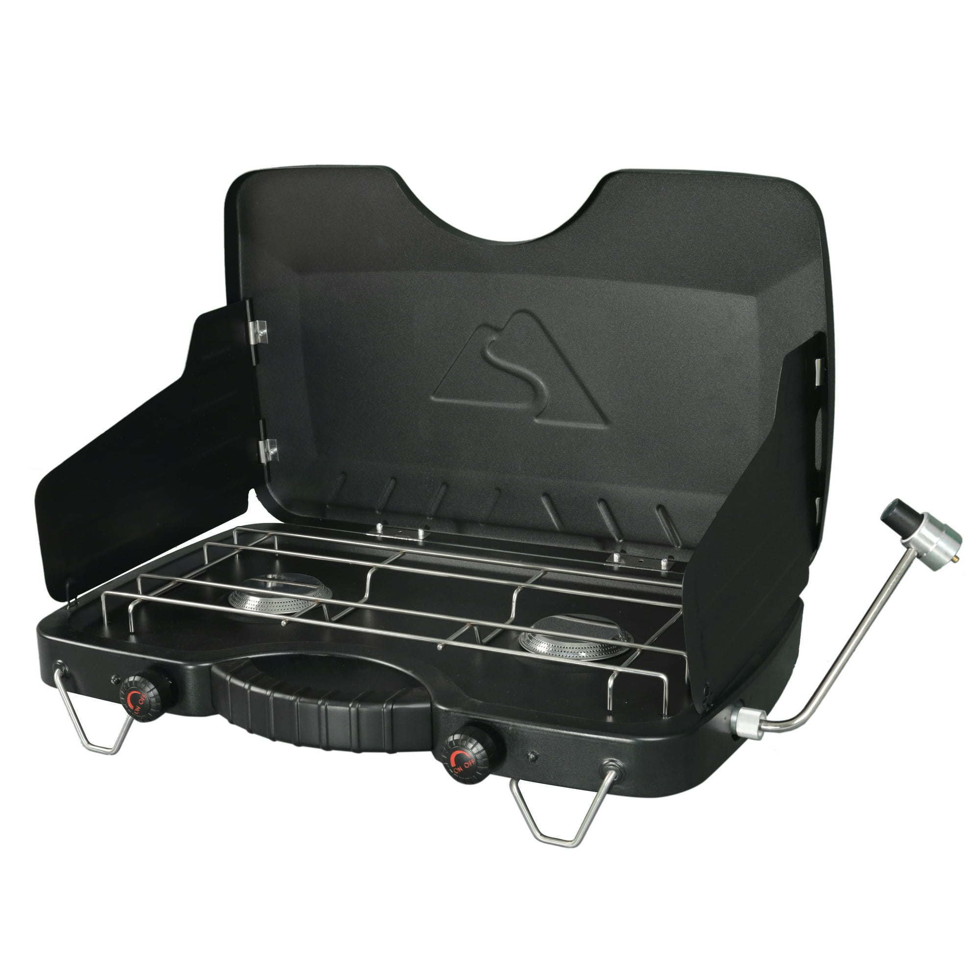 • Dual-burner propane stove is suitable for use when camping or without electricity