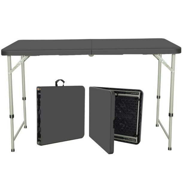 This folding table with height adjustment design brings much convenience for indoor and outdoor activities like camping, picnic, barbecue, party and more.The lightweight picnic table can be easily fold up and comes with a convenient handle, making it easy to store and transport. Three height settings ( 19"/24"/29") meet your multiple demands. The sturdy and anti-rust steel tubes plus thick HDPE tabletop make this folding table super stable and can support plenty of items with ease. The security lock, reinforced triangular structure and non-slip foot pads further enhance overall stability. Furthermore, it's easy to clean the waterproof surface with a damp cloth.