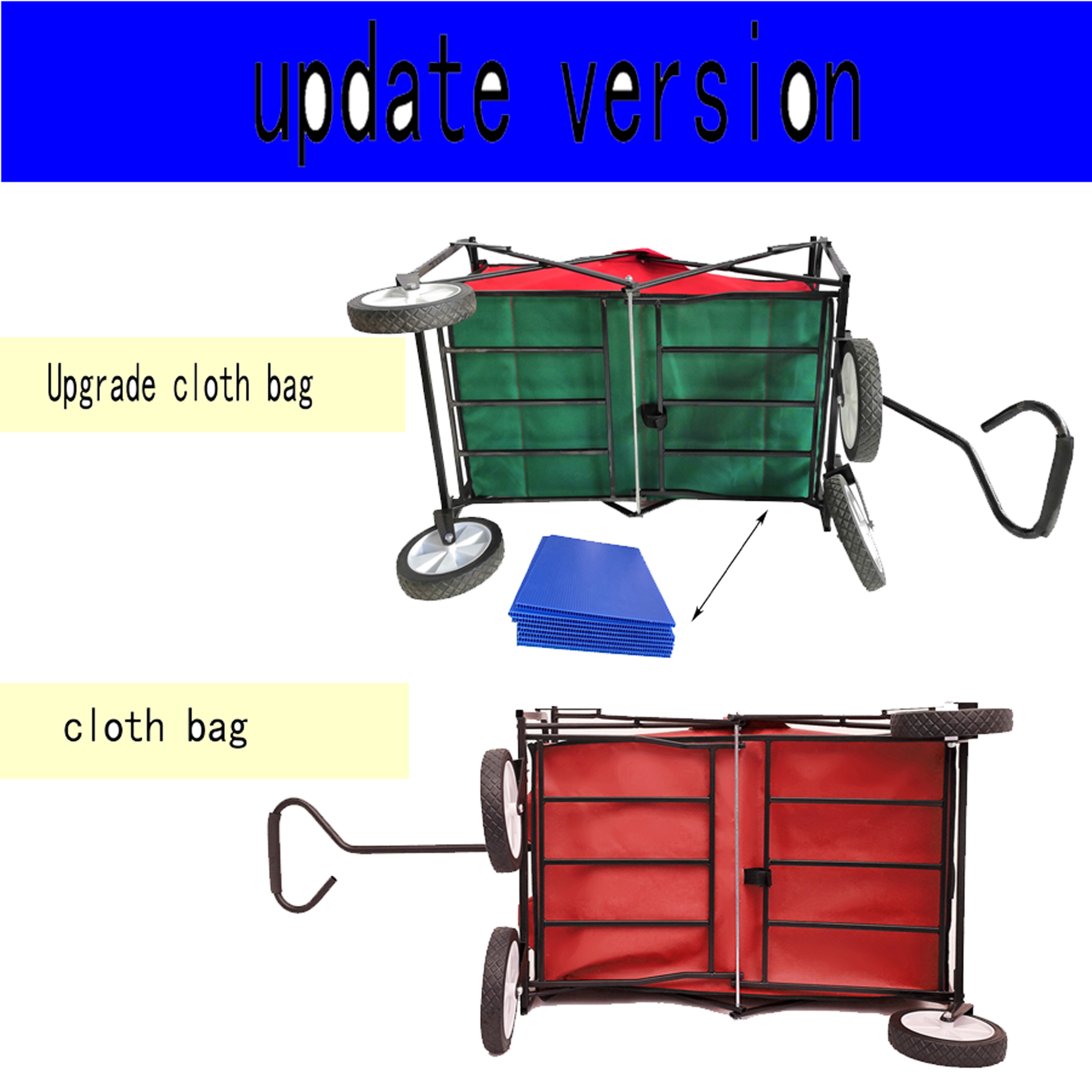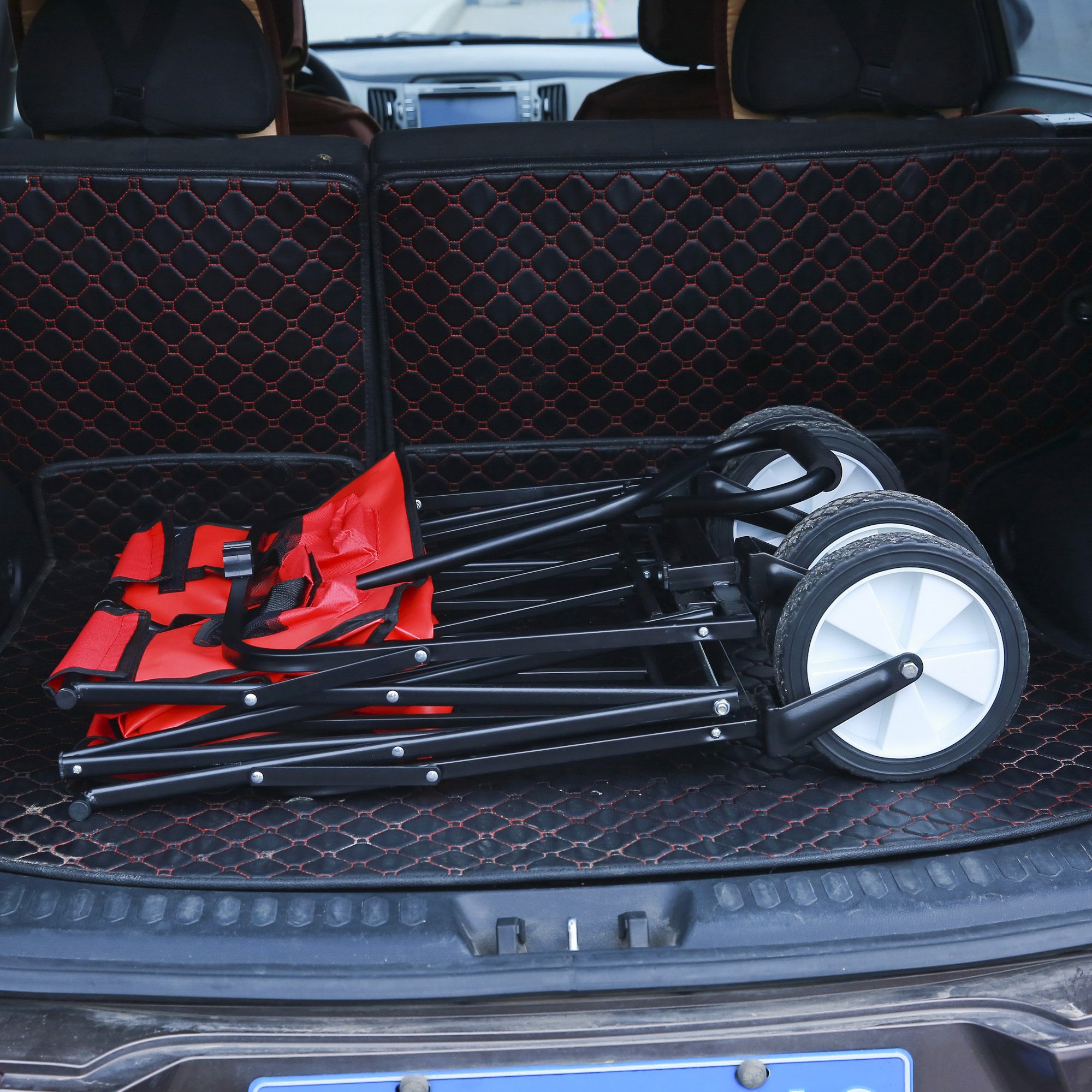 [Lots of Room]The outdoor utility wagon features the biggest bang for your buck. This large interior measures out to a capacity of 31.5" x 18.11" x 11". The utility wagon also folds out to its full size in a matter of seconds with no assembly required.[Heavy Duty]The wagon was built to last. The wagon is built using durable 600 Denier fabric. The heavy duty frame allows you to carry up to 150 pounds of gear with ease. Think of all the trips to and from the car you will save.[Functional Features]All utility wagons come with an adjustable handle for effortless transport across multiple surfaces (pavement, grass, etc.) It also comes with 2 mesh cup holders to keep your beverages safe and sound.[HIGH QUALITY]The utility wagon cart is made of strong steel and iron frame, fixed handle is firm and practical, rubber wheel is suitable for hard road and beach. Durable and waterproof 600D Oxford cloth is easy to clean and has a long service life.[WIDE RANGE APPLICATIONS]Folding utility wagons are used in a wide range of applications, such as outdoor activities, beaches, gardens, parks, camping or shopping to make your life more convenient.