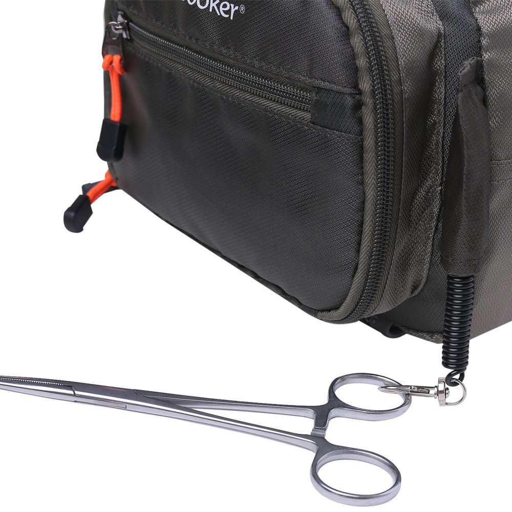 2.This Fly Fishing Bag over 10 pockets for you to keep all of your gear safe and organized. On both sides of the bag there are 2 retractable leashes for your nippers and forceps. (Note: nippers and forceps in pictures are not included)
