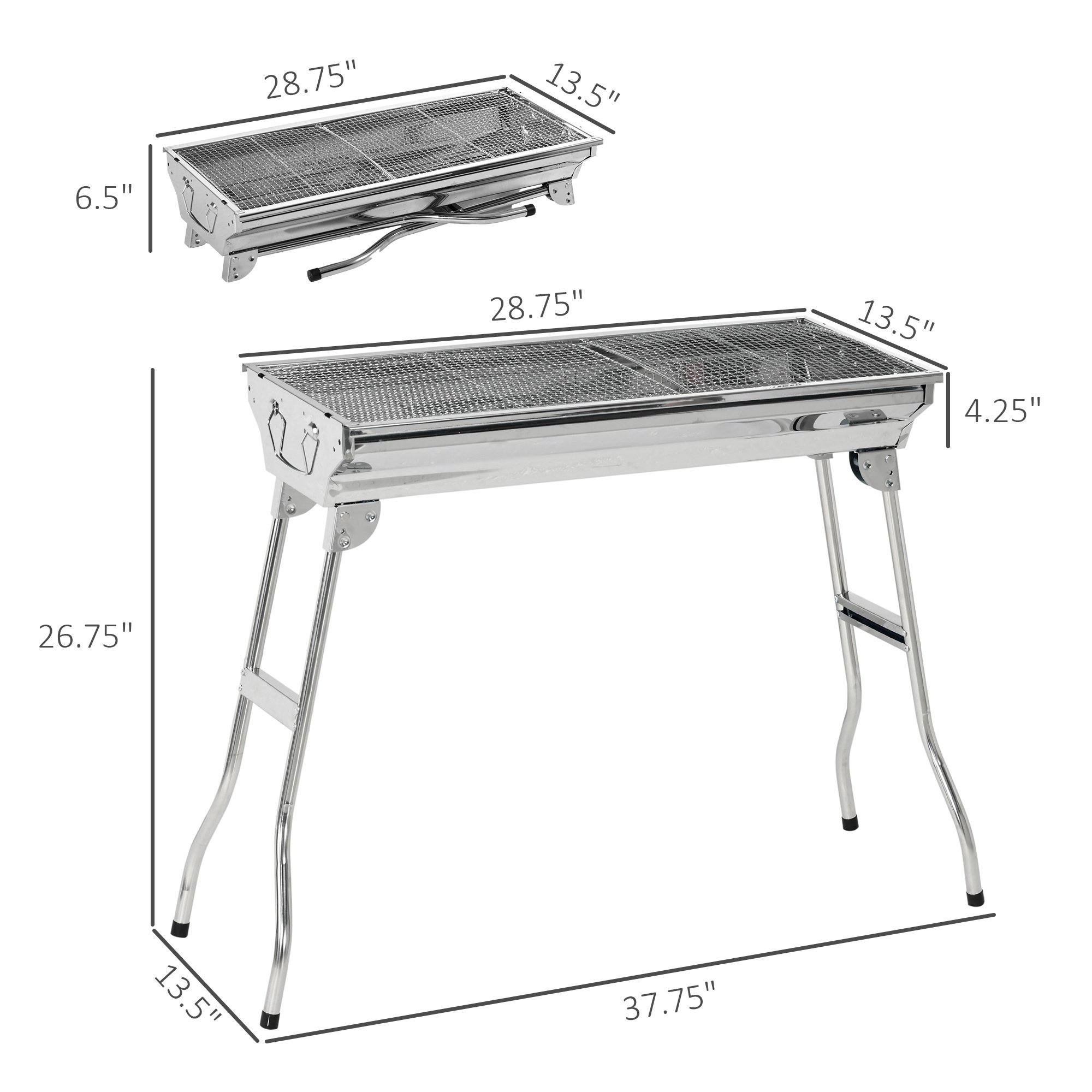 Small Portable Charcoal BBQ Grill Info: Fuel: Charcoal (do not use an open fire). Overall Dimensions: 37.75" L x 13.5" W x 26.75" H. Folded Size: 28.75" L x 13.5" W x 6.5" H. Large Baking Net: 15.5" L x 11.75" W. Small Baking Net: 11.5" L x 11.75" W.