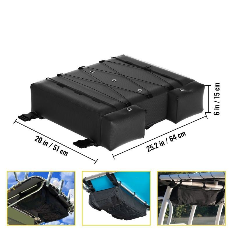 5.4 Quick-release buckles and 6 hook and loop fasteners make it easy to fix the storage bag on the top of the boat. In addition to the T-Top boat, it can be also applied in Bimini tops, pontoon tops boats and most places with rails and hooks.