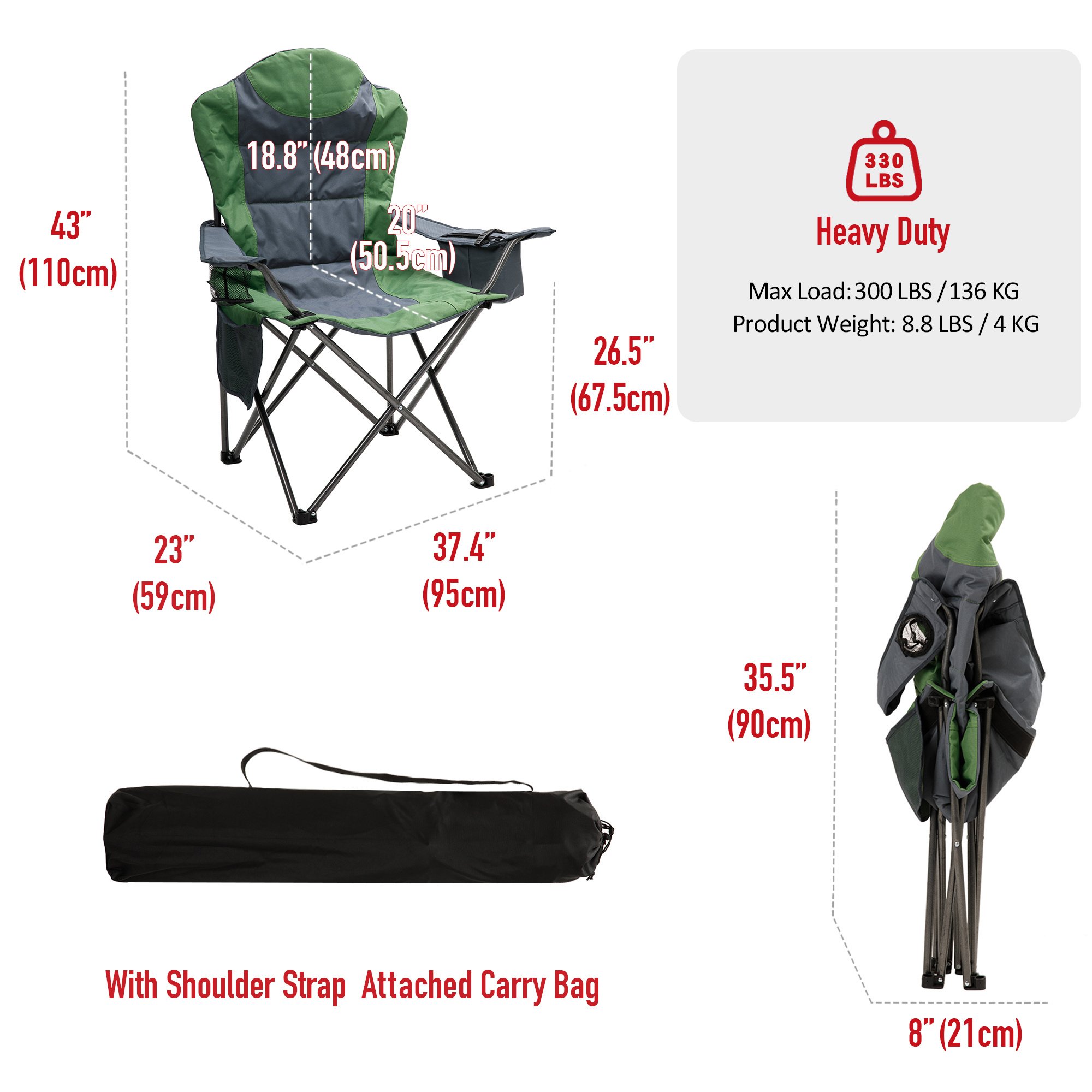 Super Oversized & Maximum Weight Capacity: The super oversized camping chairs size are 28"x42"x41", and the sturdy steel frame construction affords up to 500 LBS (227KG) weight capacity. This super oversized & padded chair high back is your best partner to help you to relax and enjoy your journey.