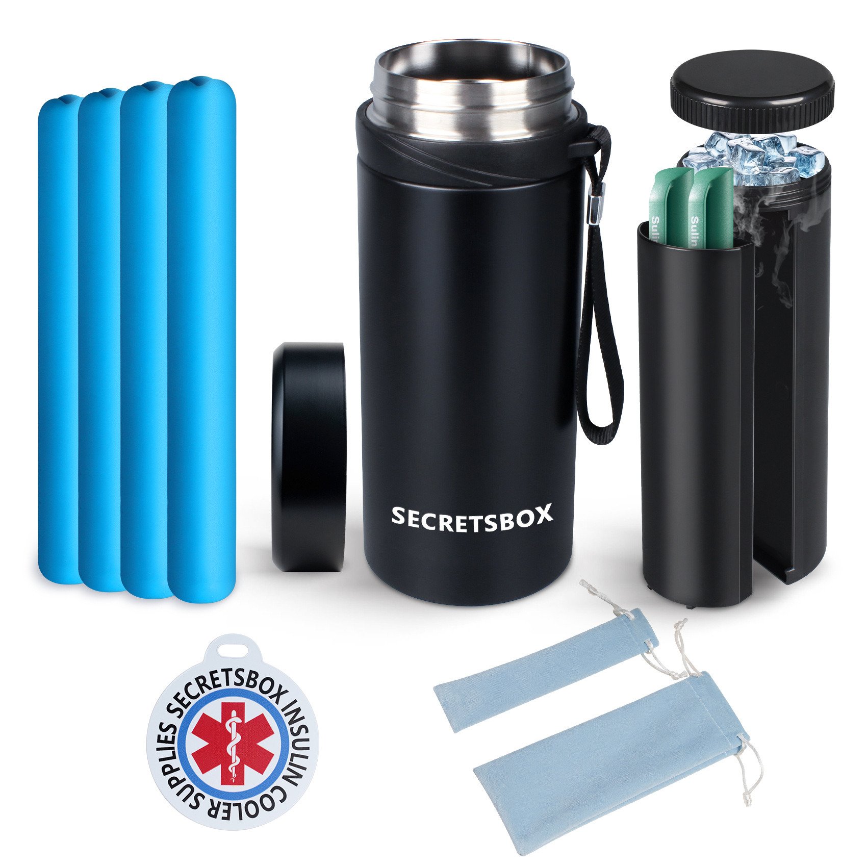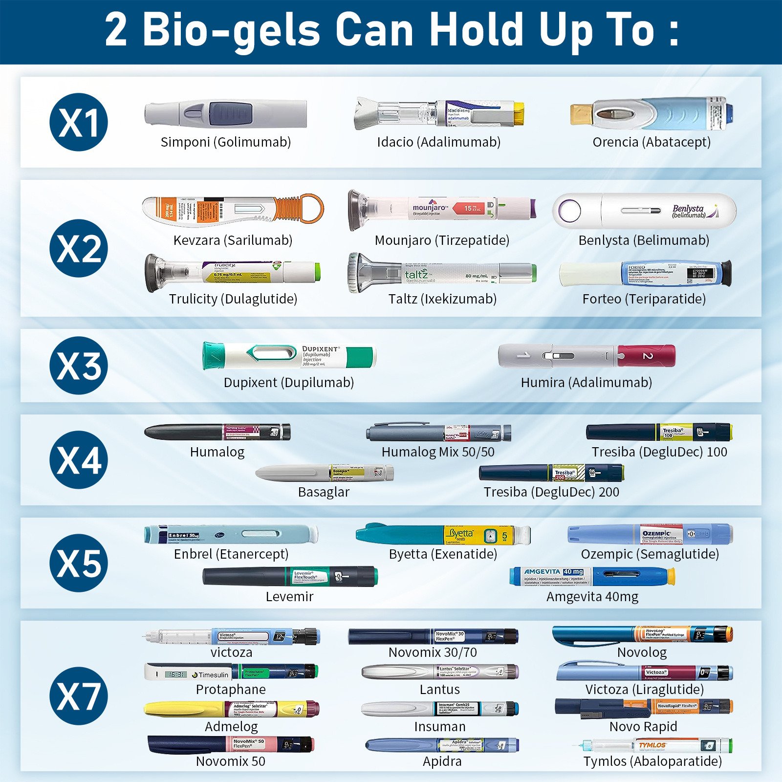 304 stainless steel cup body, food grade PP material, internal high vacuum design, used with natural bio-gel cold storage bottle, can provide 2-8 °C (36-46°F)for up to 22-36 hours under ultra-high temperature environment 104 °F to ensure drug safety.