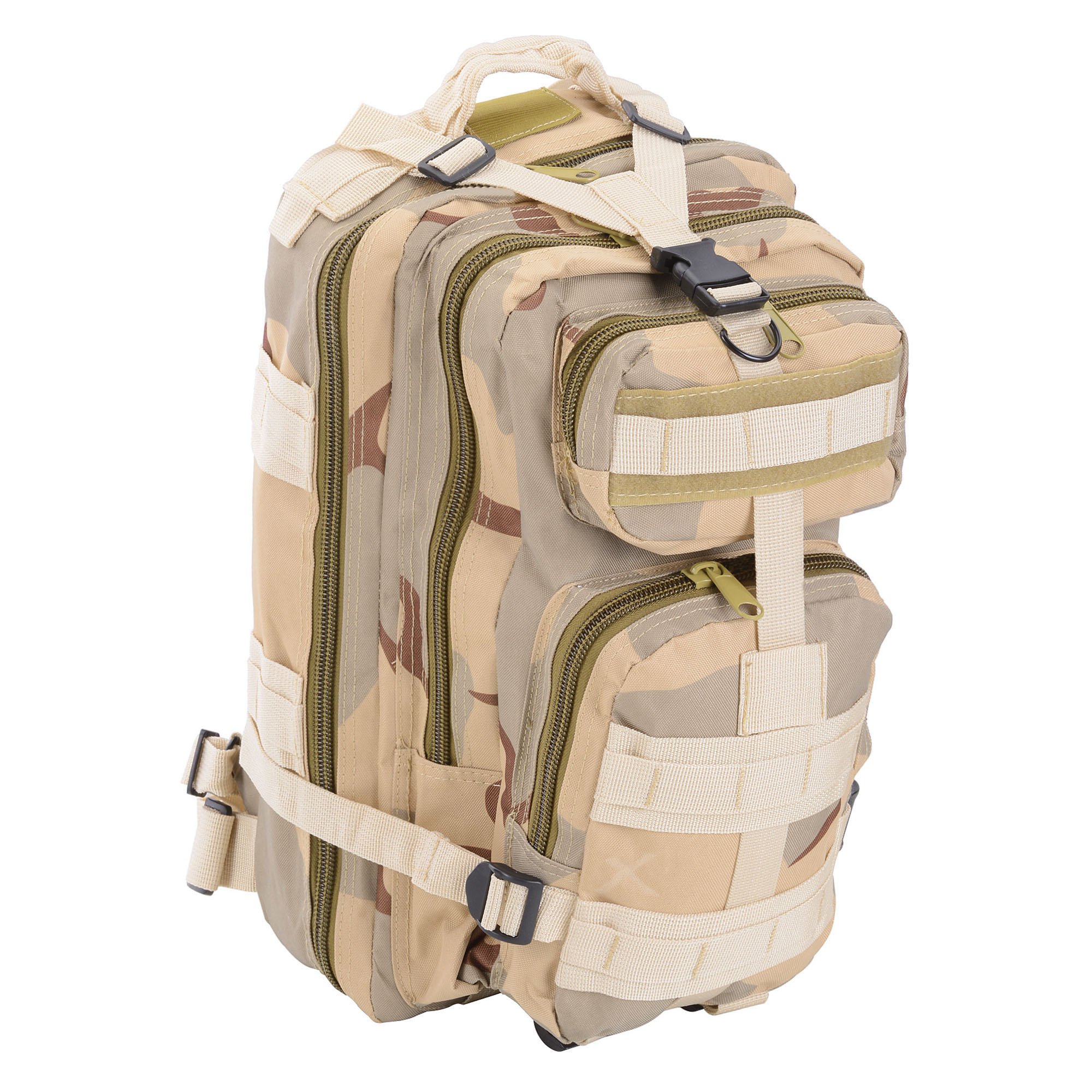 • Large Capacity &  Multiple Pockets - 17" x 10" x 8" Three Sand Camo Military  Molle Tactical Backpack with 28 L large capacity, features 2 zipped large  compartments with 2 front pockets & inner pockets, better organize and  hold all your outdoor gears in a bag, ideal for mountaineering, hiking,  camping, travel, jungle adventure and other sports activities
